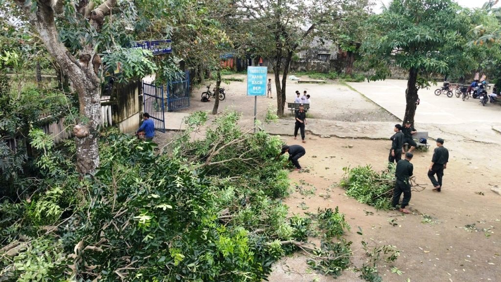 Cắt tỉa cây xanh trong khuôn viên trường học để đảm bảo an toàn tránh ngã đổ khi bão đổ bộ.