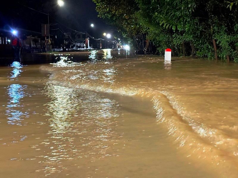 Đến khoảng 21 giờ ngày 29/10, nhiều vị trí trên tuyến Quốc lộ 24B vẫn đang bị ngập sâu, phương tiện không thể lưu thông được.