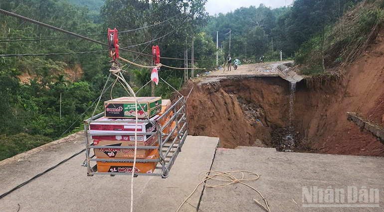 Dùng ròng rọc tự chế để vận chuyển nhu yếu phẩm thiết yếu cho người dân thôn Tà Vinh, xã Sơn Tây Hạ bị cô lập do tắc đường.