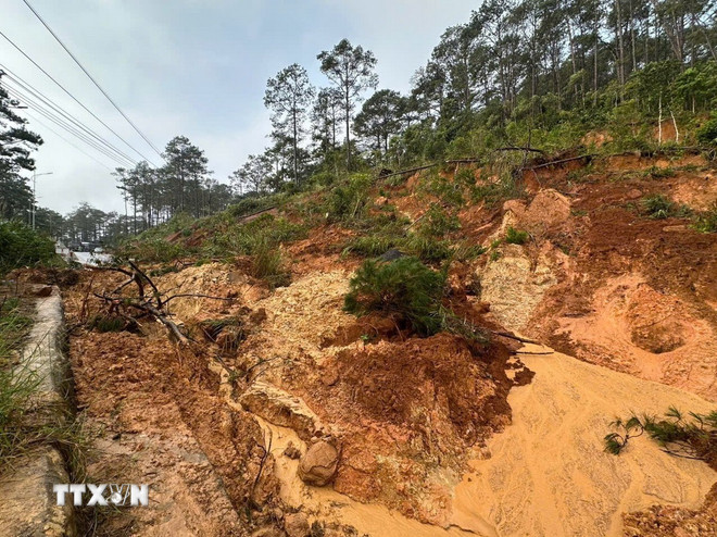 Sạt lở tại km 112+900 đã chia cắt hoàn toàn tuyến Quốc lộ 24. (Ảnh: Dư Toán/TTXVN)