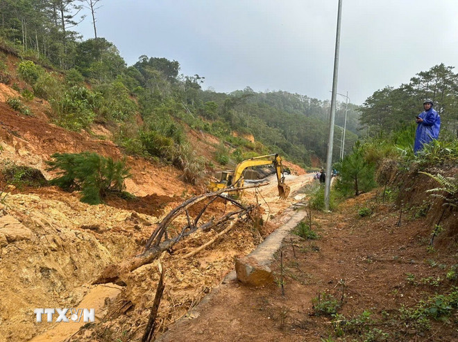 Khối lượng lớn đất đá từ trên đỉnh đồi sạt xuống gây ách tắc giao thông. (Ảnh: Dư Toán/TTXVN)