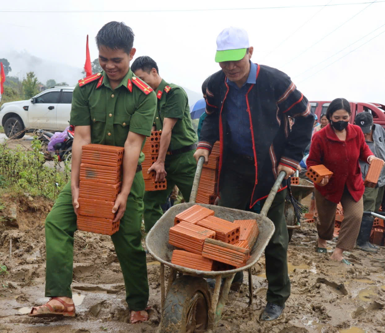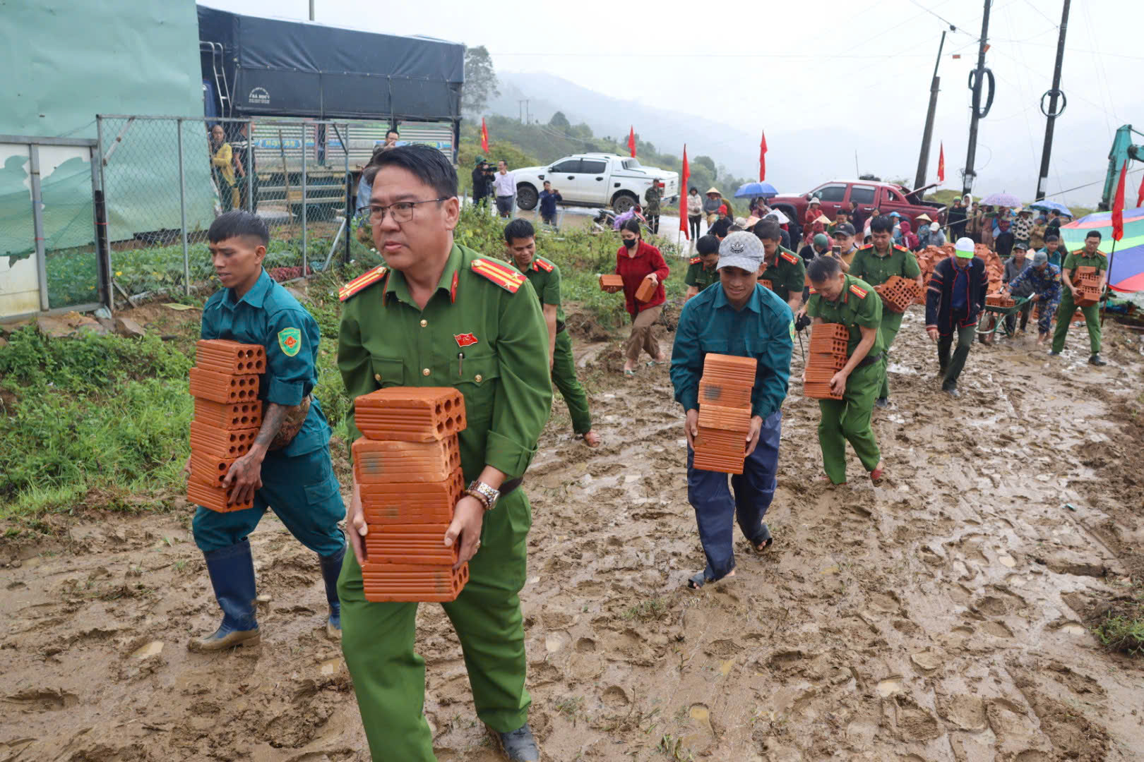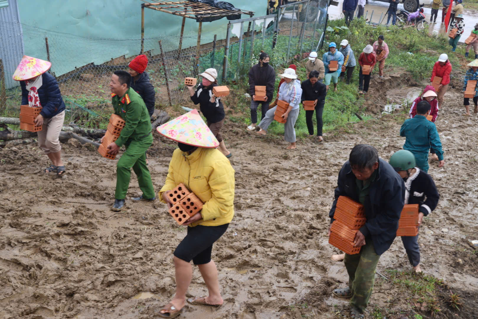 Tại lễ phát động, hàng trăm cán bộ thuộc lực lượng công an, dân quân, cán bộ thôn, xã cùng người dân vận chuyển gạch đến các vị trí bố trí tái định cư.