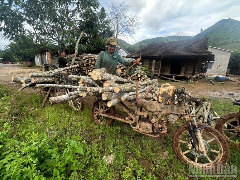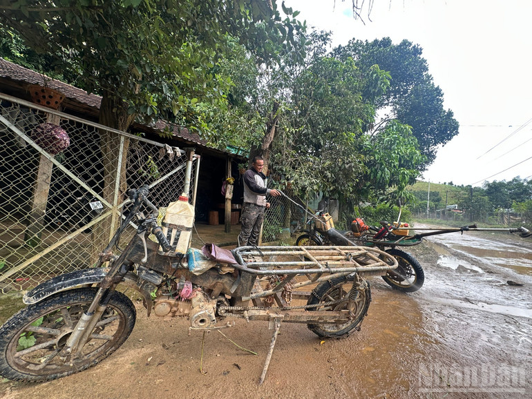 Trên triền núi cách nhà hơn 2km, vợ chồng anh A Quang Nam ở thôn Đăk Ak trồng hơn 200 gốc cà-phê cùng 3 sào sắn. Cứ đến mùa thu hoạch, vợ chồng anh thở dài ngao ngán. Phương tiện chính vận chuyển nông sản từ vườn về nhà là chiếc xe máy “cà tàng” do anh lắp ráp thêm thiết bị. Chiếc xe máy được gắn thêm bộ khung sắt dài hơn nửa mét, bình xăng nhựa gắn gần tay lái, ống dẫn chuyển xăng xuống máy xe bên dưới.