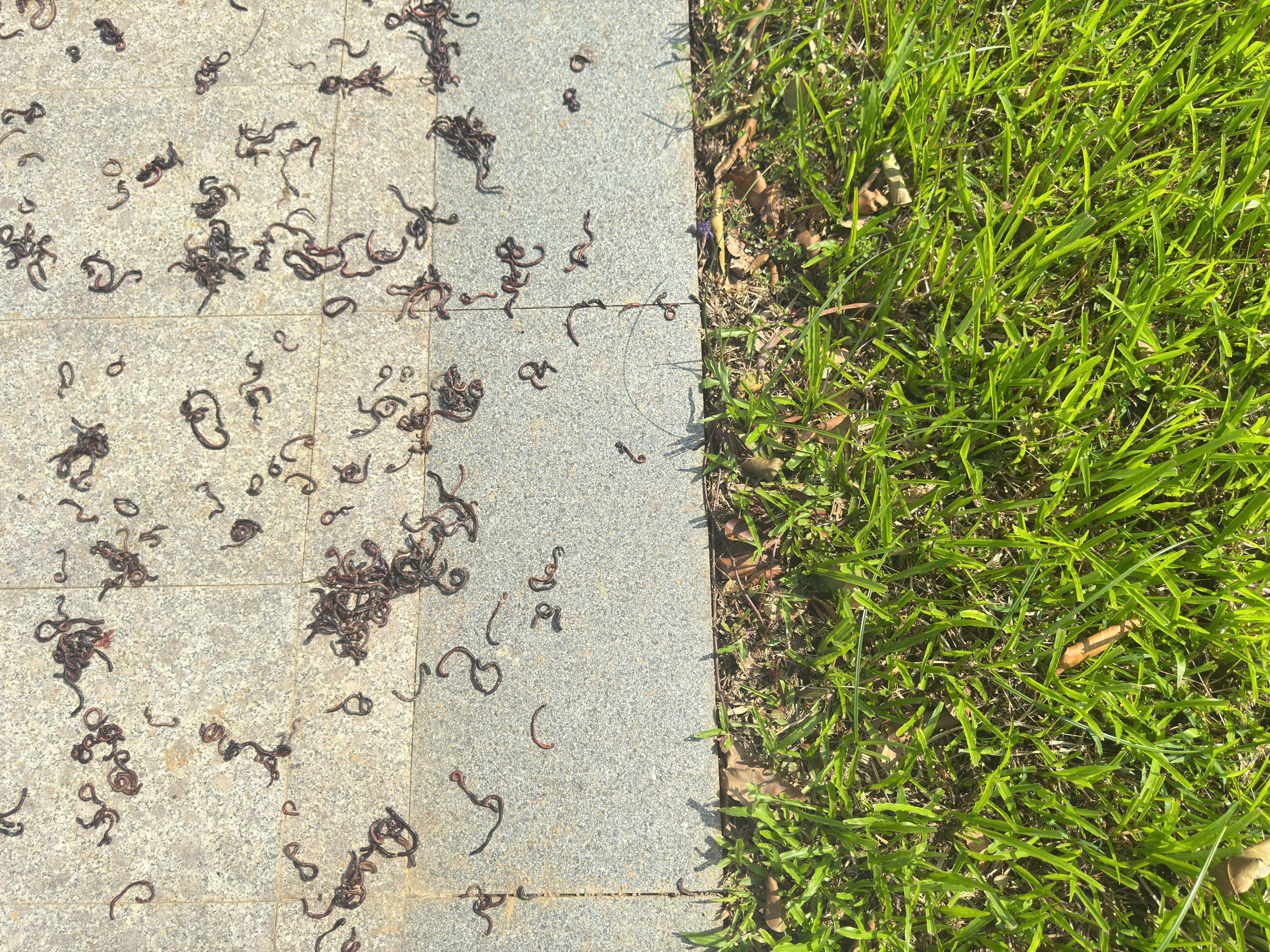 Giun đất từ bãi cỏ bò lên nền gạch, vài con chết khô