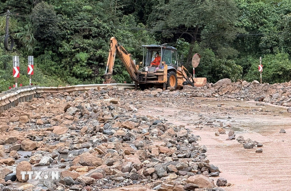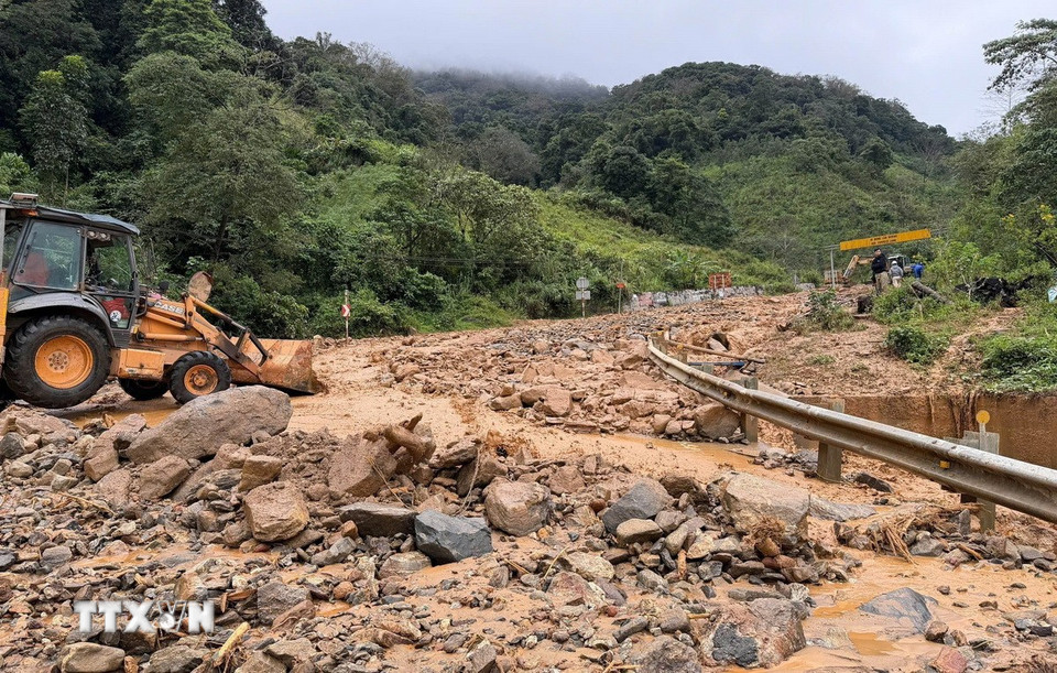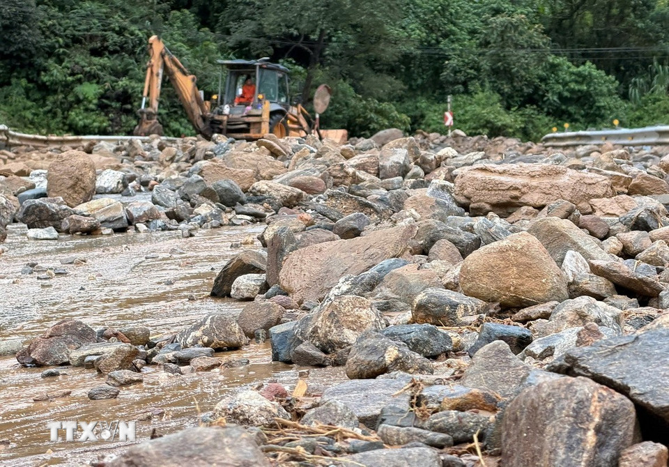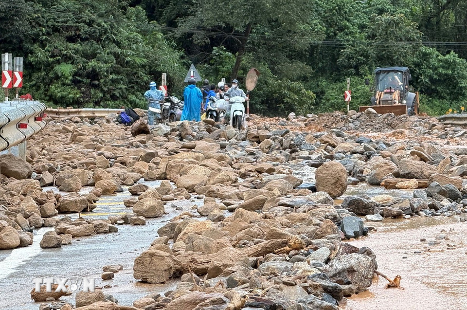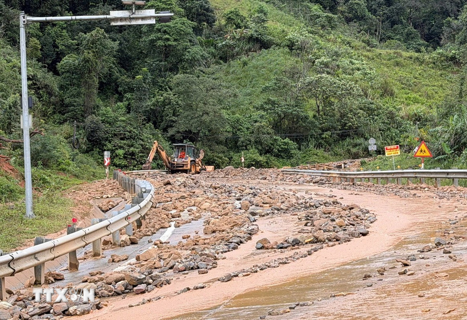 Hàng ngàn m3 đất, đá tràn ra mặt đường khiến giao thông tê liệt hoàn toàn. (Ảnh: Cao Nguyên/TTXVN)