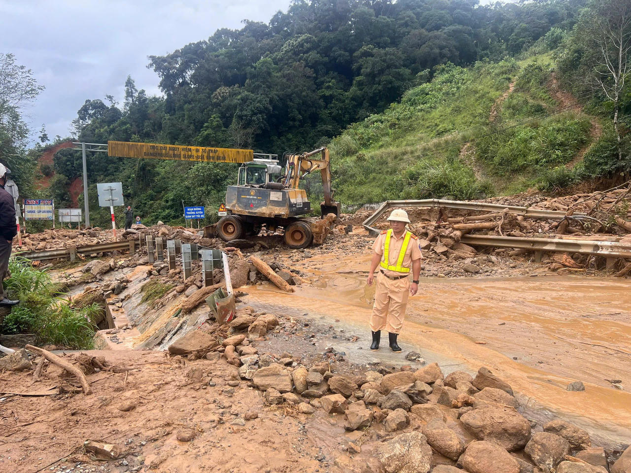 Lực lượng chức năng và đơn vị quản lý đường đang khẩn trương huy động phương tiện, thu dọn đất đá, khơi thông dòng chảy, sớm đảm bảo an toàn cho người và phương tiện qua lại đèo.