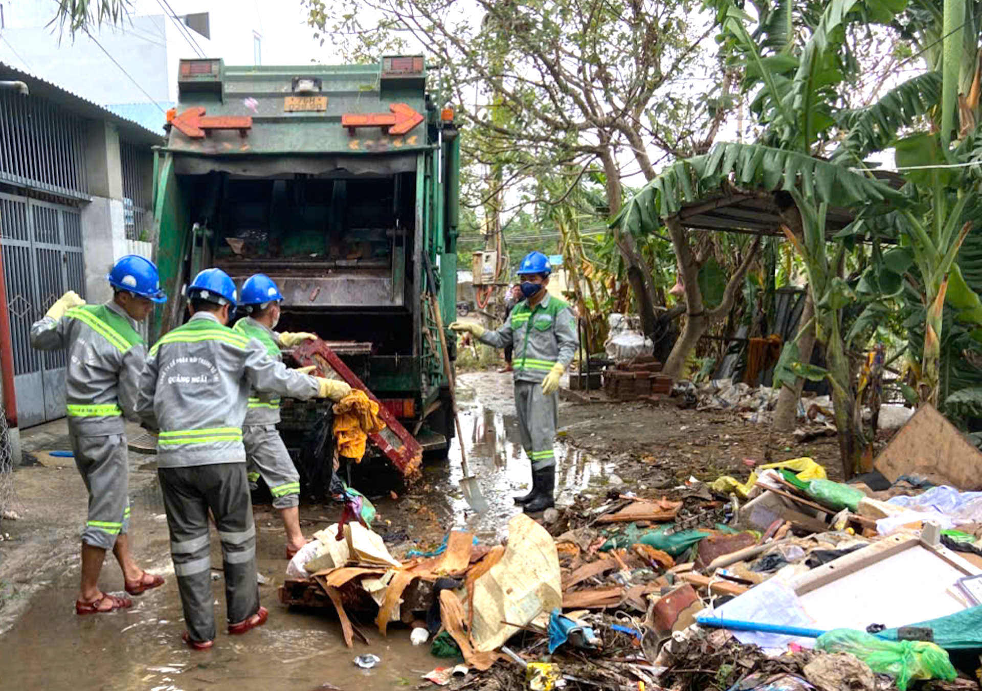 Công nhân môi trường đô thị Quảng Ngãi vào Đắk Lắk hỗ trợ dọn dẹp vệ sinh môi trường sau lũ.
