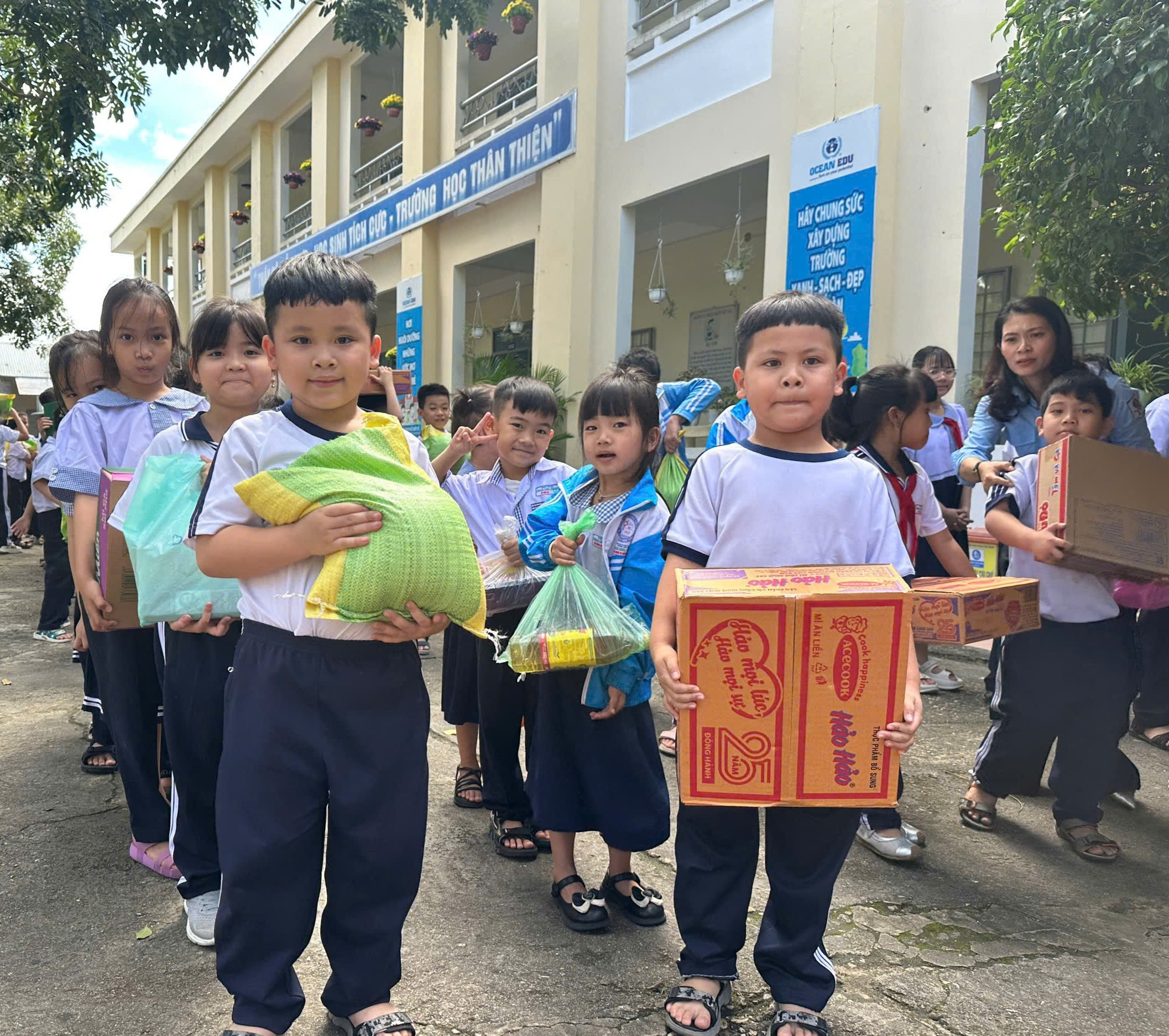 Học sinh Trường Tiểu học Phan Chu Trinh mang nhu yếu phẩm đến ủng hộ người dân vùng lũ