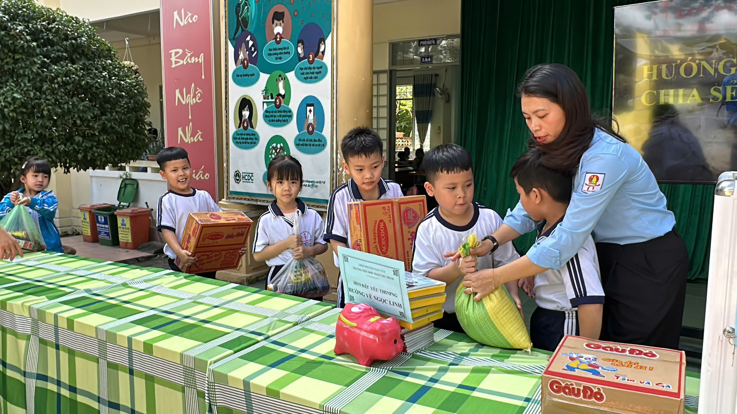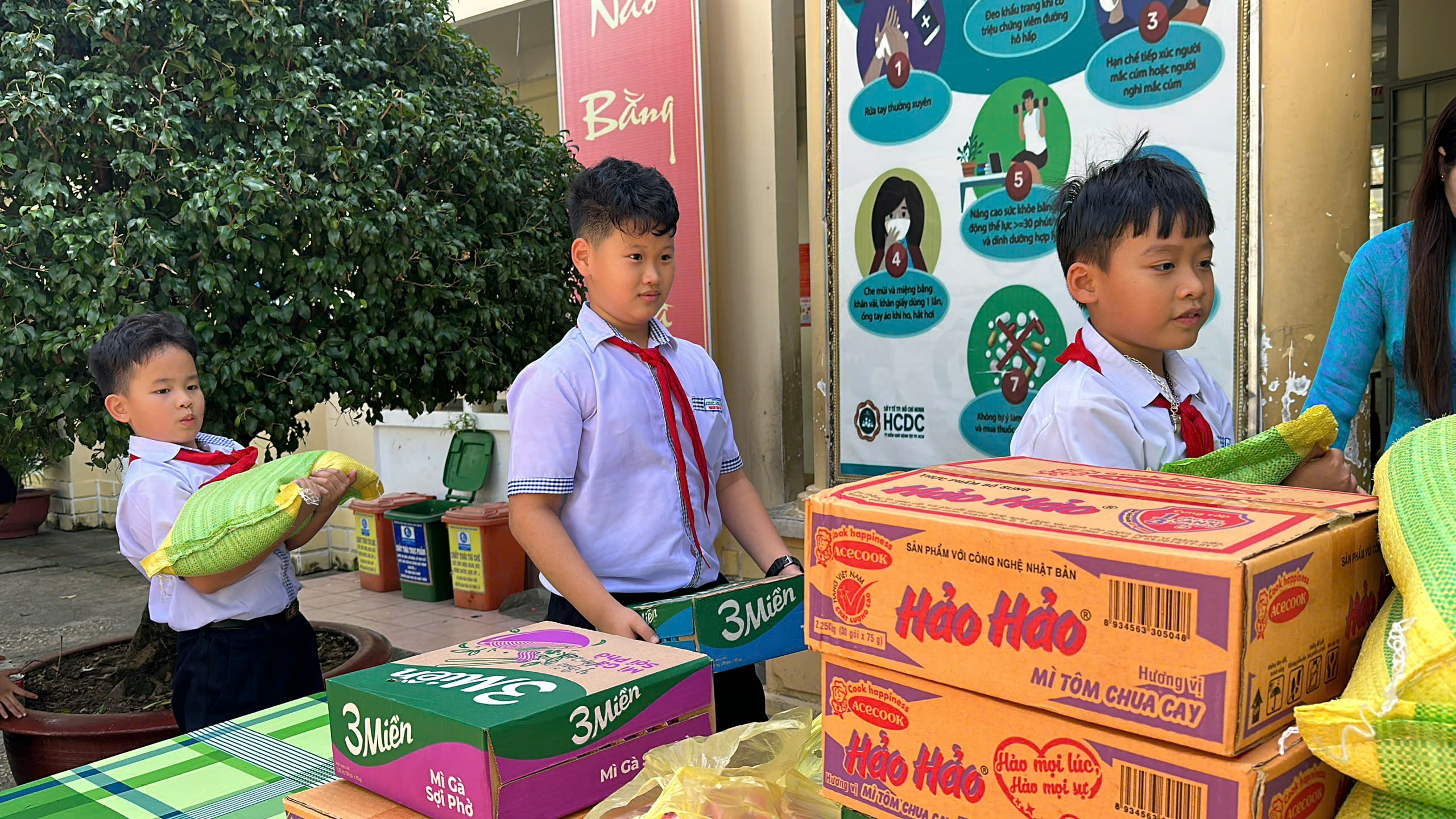 Học sinh Trường Tiểu học Phan Chu Trinh ủng hộ mì tôm, gạo