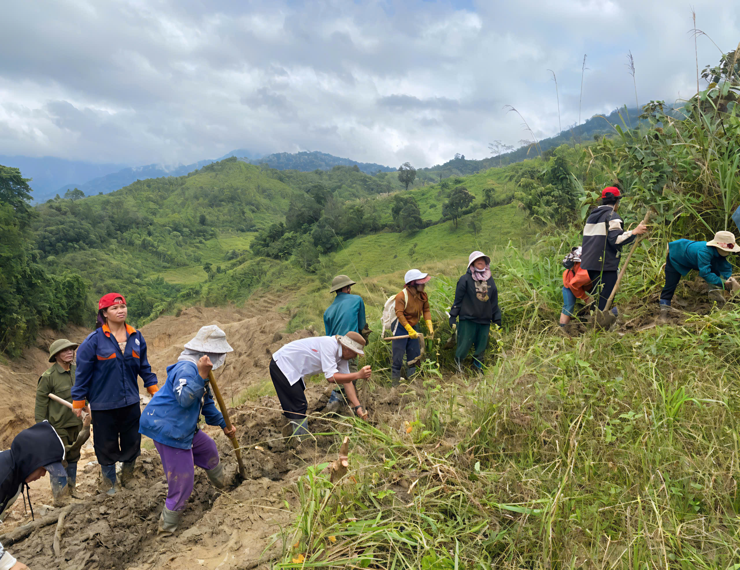 Lực lượng dùng cuốc, xẻng, rựa phát quang cây cối, san gạt đất đá để mở đường. Không khí làm việc khẩn trương, quyết tâm sớm hoàn thành lối đi tạm, đưa hàng cứu trợ vào vùng bị cô lập.