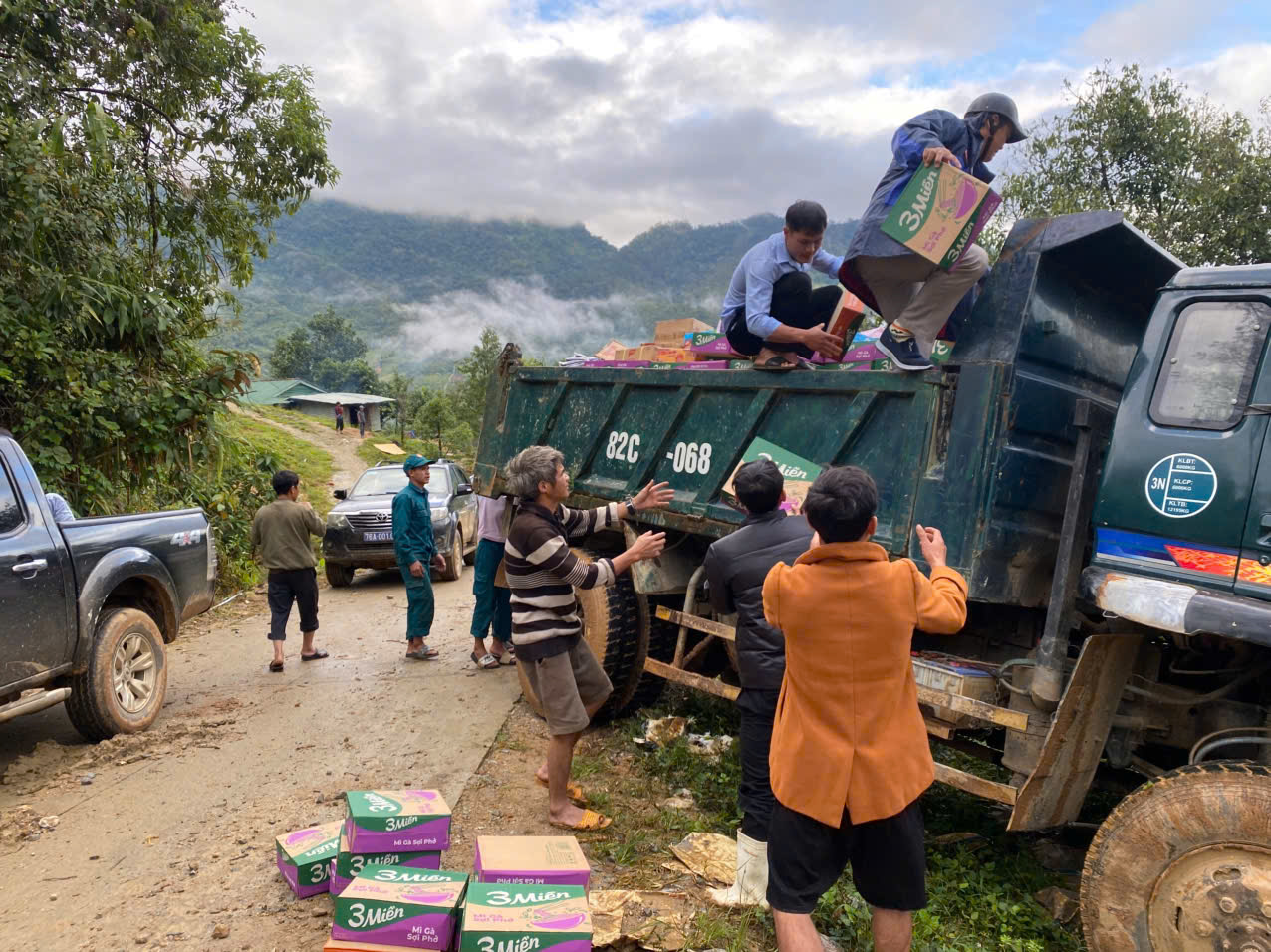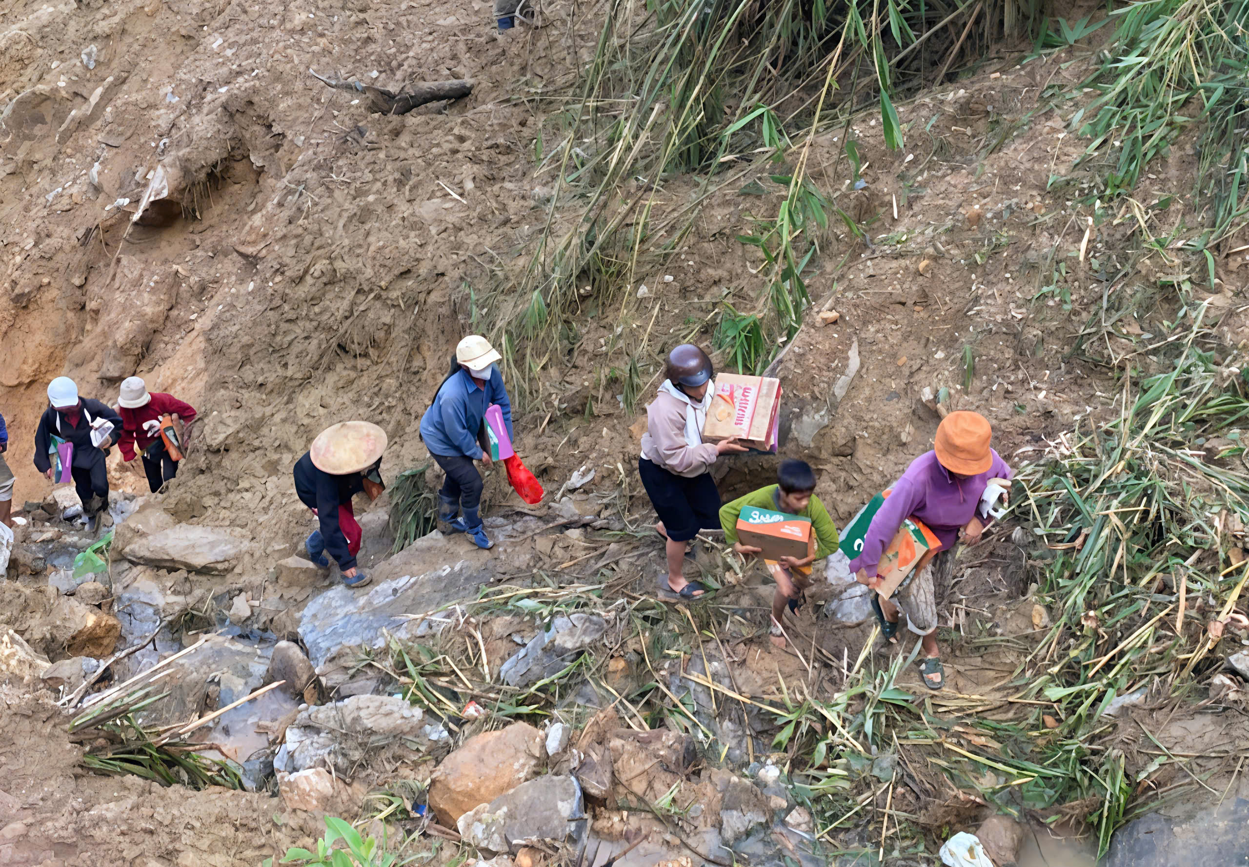 Trong sáng cùng ngày, xe tải chở hàng hỗ trợ của Sở Công thương Quảng Ngãi gồm gạo, mì tôm, nước, áo quần, dầu ăn, nước mắm… đã được vận chuyển đến đầu điểm sạt lở, bốc dỡ sẵn sàng chờ thông đường để người dân gùi về cấp phát. Đến 9 giờ 30 cùng ngày, người dân đã tiếp cận được hàng cứu trợ, gùi hàng hóa về sử dụng.