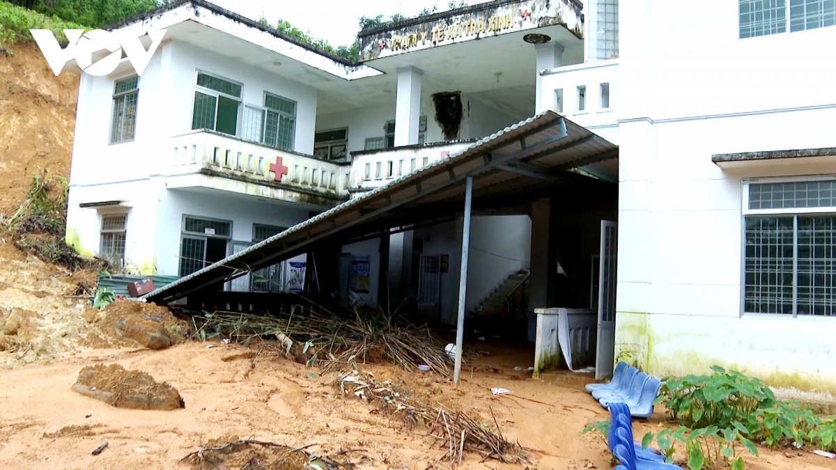 Sạt lở làm lấp hoàn toàn nhà xe, làm hư hại mái hiên, xô đổ tường ở tầng trệt ở Trạm Y tế Trà Xinh.