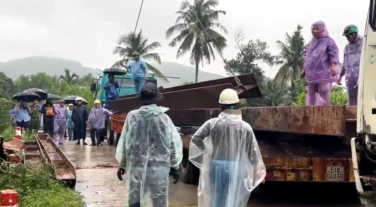Dầm sắt cùng xe cẩu được điều động, gấp rút xây cầu tạm phá thế cô lập do sập cầu.