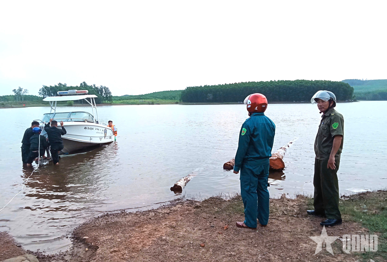 Các lực lượng triển khai các biện pháp tìm kiếm nạn nhân đuối nước tại đập Gò Lang.