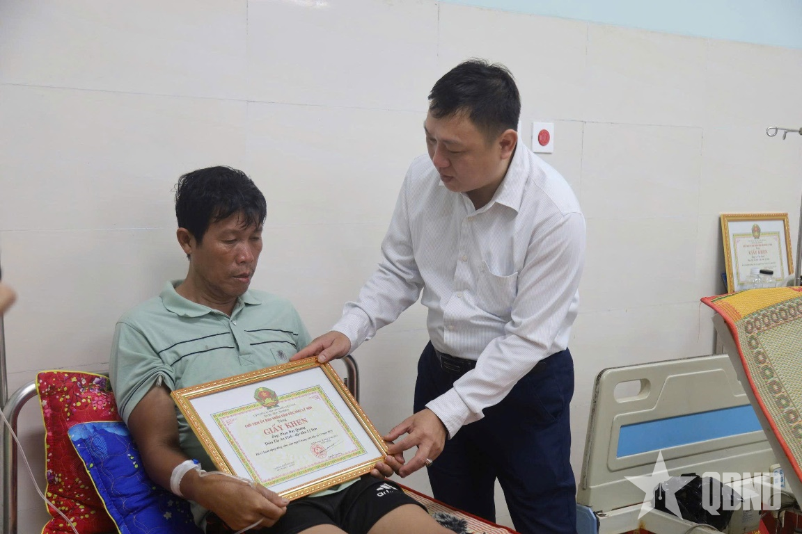 Chủ tịch UBND đặc khu Lý Sơn Nguyễn Văn Huy trao khen thưởng và động viên ông Phan Duy Quang.