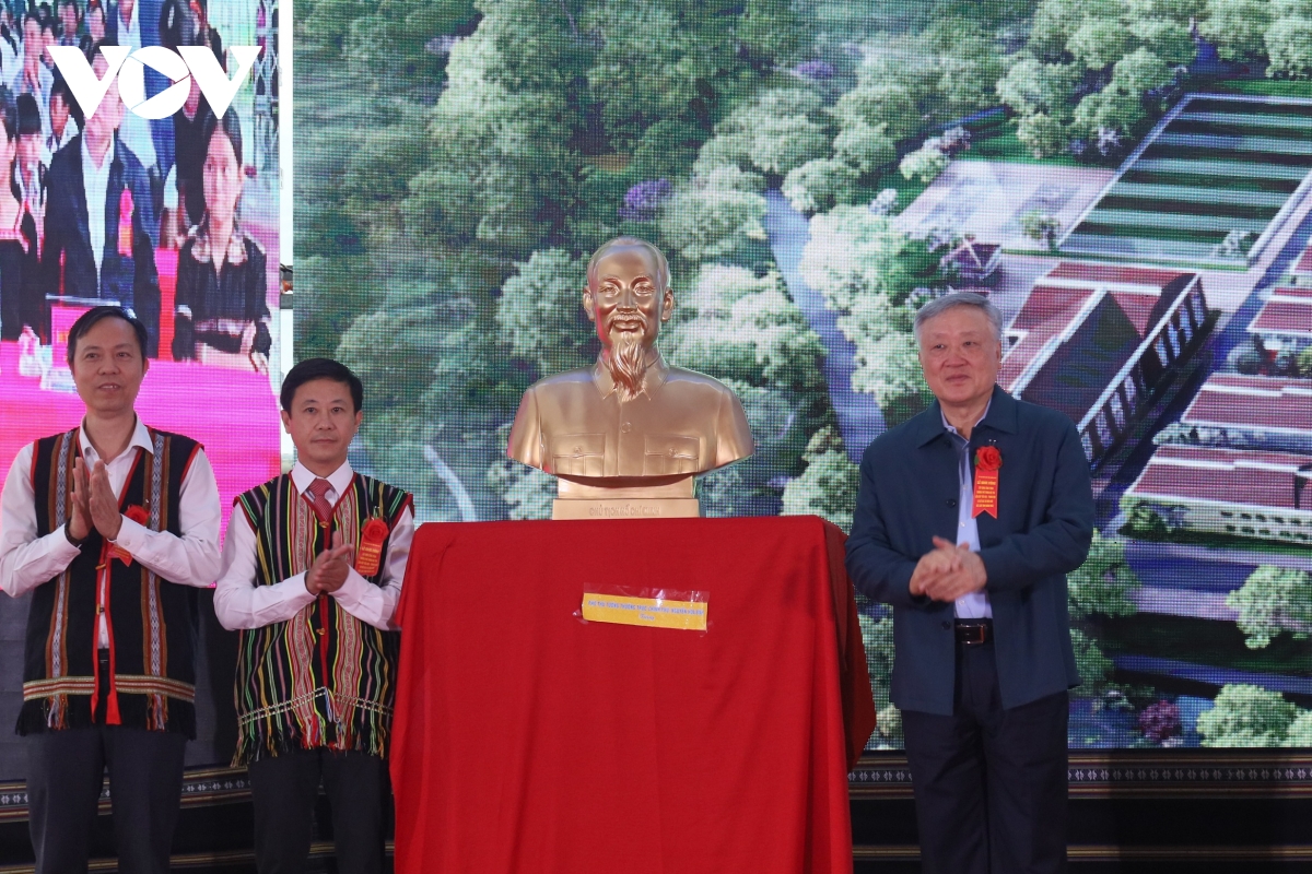 Phó Thủ tướng Thường trực Chính phủ Nguyễn Hòa Bình trao tặng tượng Bác Hồ cho Trường Phổ thông Nội trú liên cấp xã Dục Nông.
