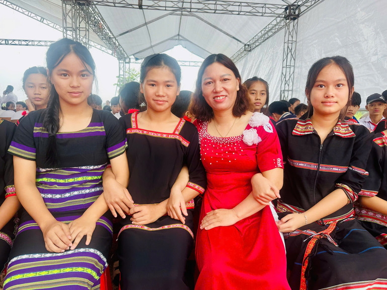 Cô giáo và học sinh Trường Tiểu học và Trung học cơ sở Võ Nguyên Giáp, xã Mô Rai.