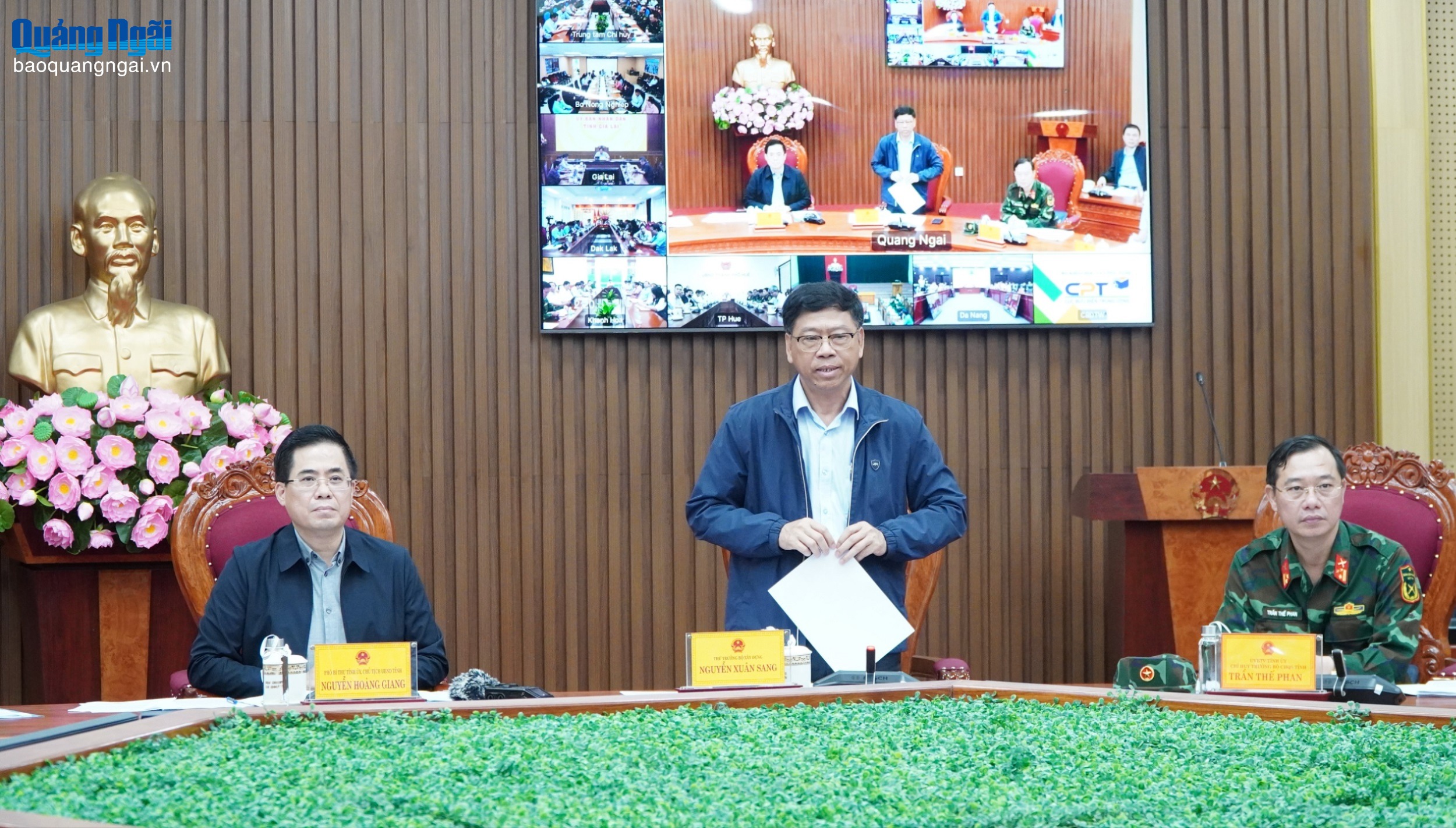 Phó Bí thư Tỉnh ủy, Chủ tịch UBND tỉnh Nguyễn Hoàng Giang báo cáo Phó Thủ tướng tình hình ứng phó với bão số 13 từ điểm cầu Quảng Ngãi.