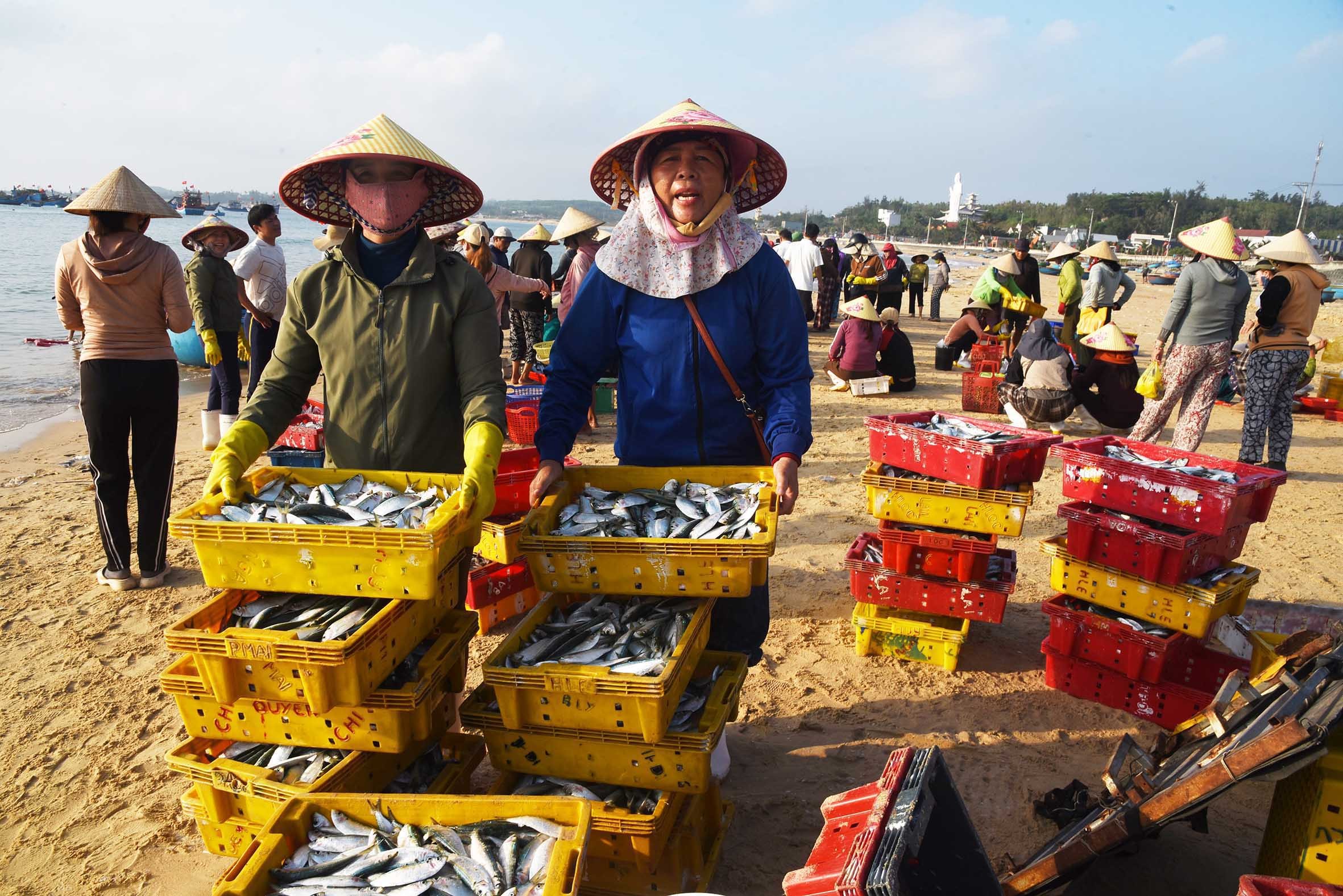Thu mua hải sản từ các tàu cá ở Phước Thiện buổi sáng