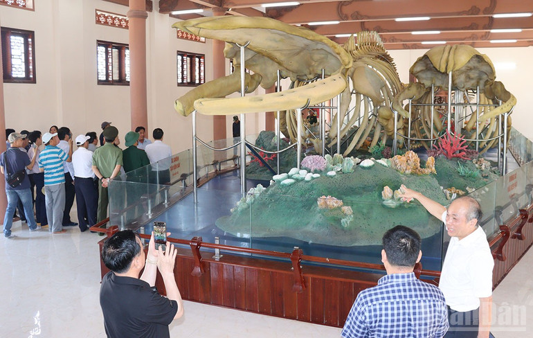 Du khách chiêm ngưỡng 2 bộ xương cá Ông (cá Voi) lớn nhất Việt Nam, được phục dựng, trưng bày tại Lăng Tân, đặc khu Lý Sơn.
