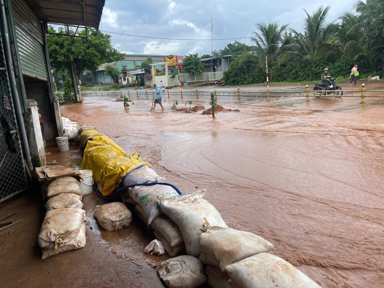 Đến 10 giờ 30 sáng ngày 6-10, thôn Tân Lập A tiếp tục xảy ra mưa, bùn đỏ chảy ồ ạt trên đường. Người dân phải dùng bao cát chắn trước cửa nhằm ngăn chặn bùn đất, nước chảy vào nhà.