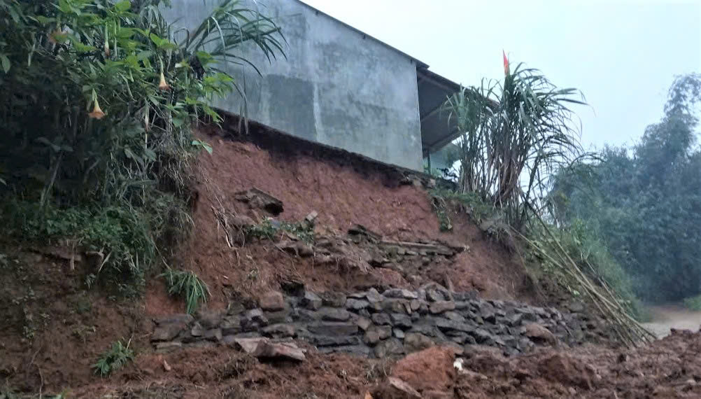 Một ngôi nhà của người dân miền núi Quảng Ngãi bị lũ cuốn phăng tường chắn bảo vệ gây nên sạt lở nặng.