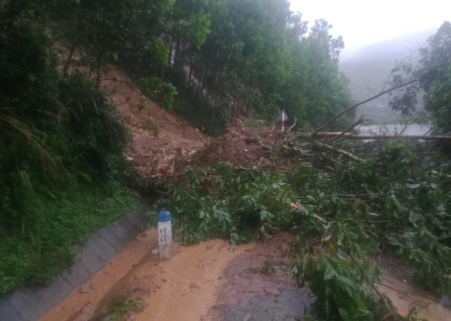 Khối lượng lớn đất, đá và cây rừng từ núi cao đổ ầm xuống bịt kín mặt đường QL24C đoạn qua đèo Eo Tà Mỏ. Tuyến giao thông nối với các địa phương Tây Nam TP Đà Nẵng bị tê liệt hoàn toàn.