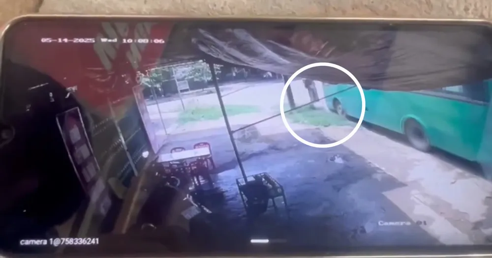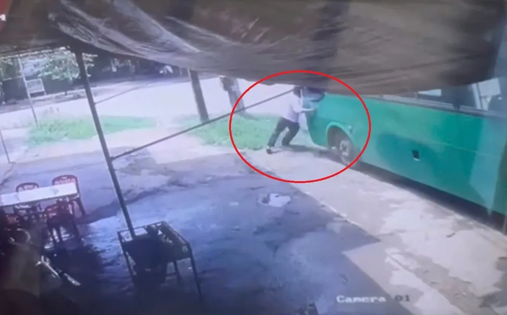 Hình ảnh nam nhân viên phục vụ cố gắng ngăn chặn chiếc xe buýt trôi.