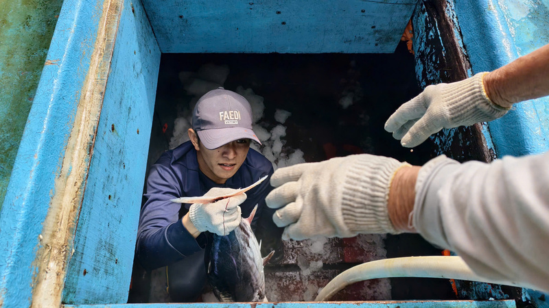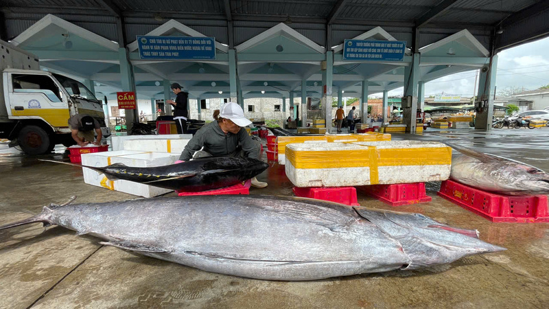 Từng con cá ngừ đại dương sẽ được đóng vào từng thùng xốp chất đầy đá lạnh rồi các thương lái đến mua. Ảnh: Nguyễn Dương