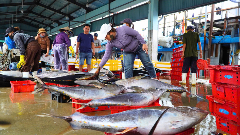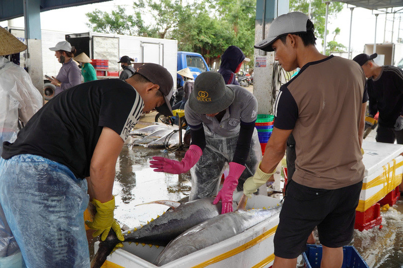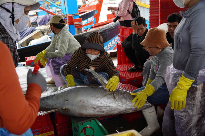 Hiện giá cá ngừ đại dương dao động từ 100.000 – 120.000 đồng/kg, trung bình mỗi con nặng từ 20 – 80kg. Ảnh: Nguyễn Dương