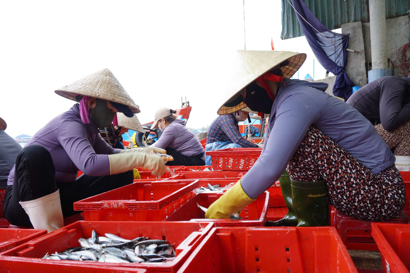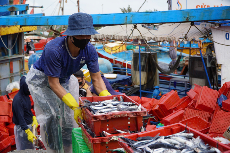 Tại cảng Tịnh Kỳ (xã Tịnh Khê, tỉnh Quảng Ngãi) nhiều tàu cá của ngư dân phường Trà Câu chuyên hành nghề câu cá ngừ đại dương liên tục cập cảng, hối hả bốc dỡ hải sản.