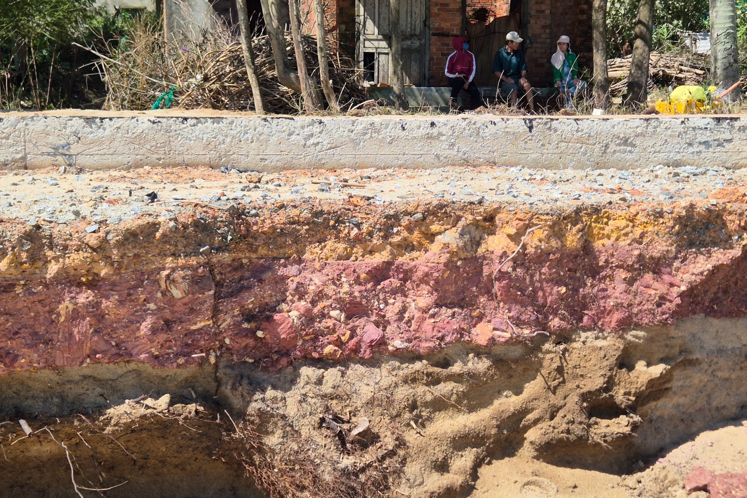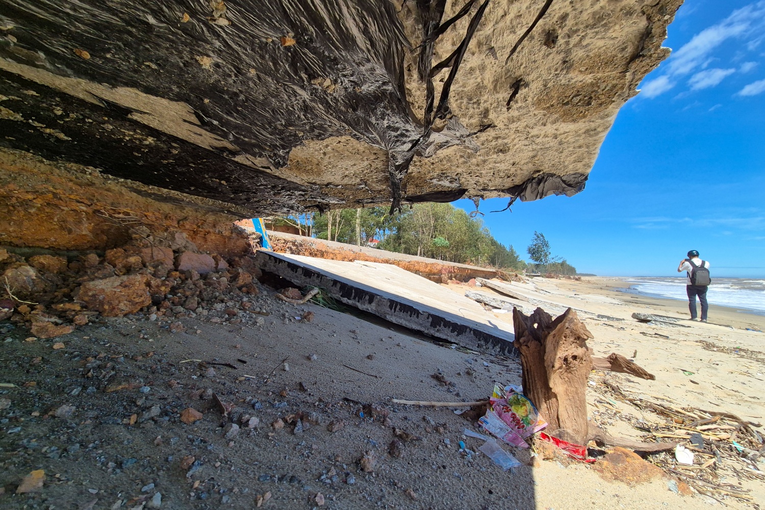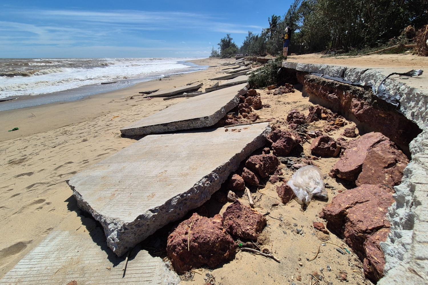 Cách bờ biển Sa Huỳnh khoảng 60km, tuyến đường ven biển thôn Đức Lợi cũng đã bị sạt ở nghiêm trọng, khoét sâu vào lòng đất.