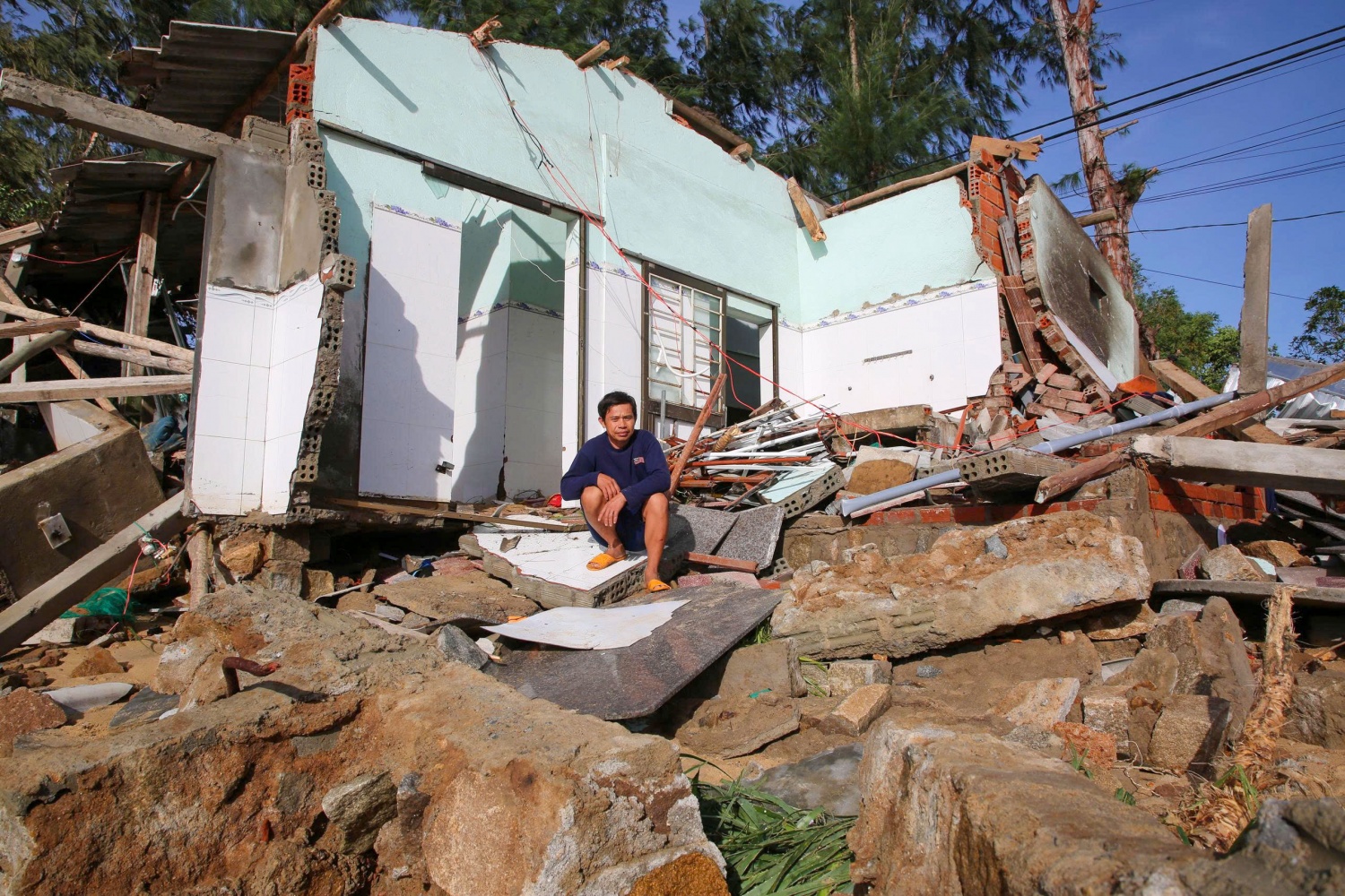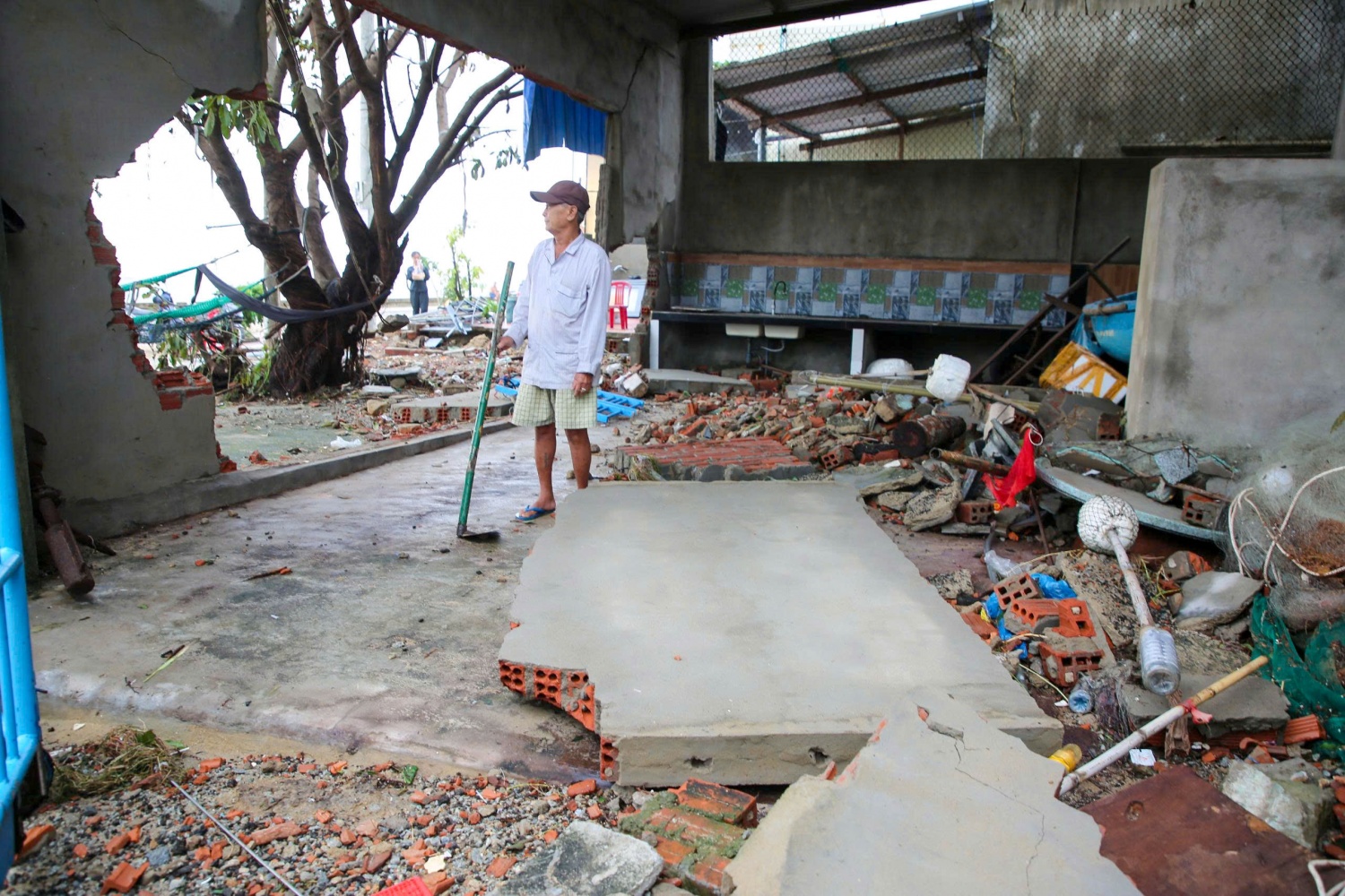 Ông Hồ Tỏ - trú tại Tổ dân phố Châu Me thất thần ngồi bên những mảng tường đã vỡ từ căn nhà của mình. Ông Tỏ cho biết: "Cả nhà tôi tối qua được chính quyền đưa đi tránh trú bão để đảm bảo an toàn. Đến sáng nay khi trở về thì nhiều thứ đã hư hỏng nặng, căn nhà cũng đã bị sập, chỉ còn lại những mảnh tường vỡ vụn".