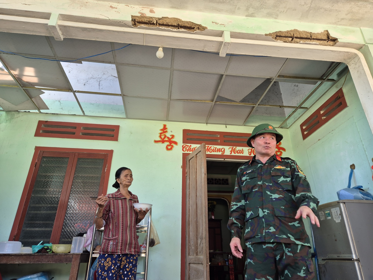 Đại tá Trịnh Công Sơn chỉ đạo các chiến sĩ hỗ trợ gia đình bà Cận khắc phục hậu quả thiên tai.