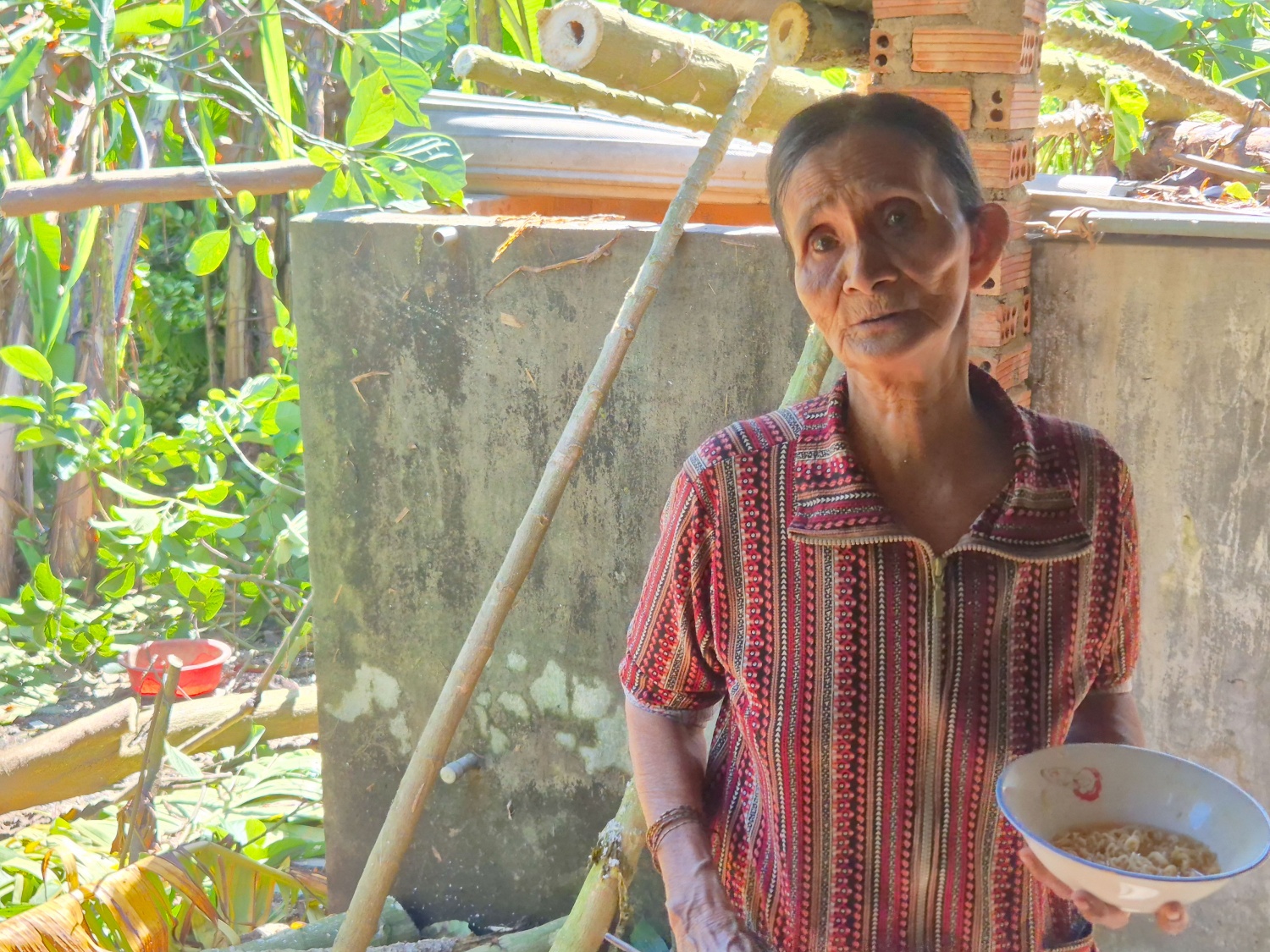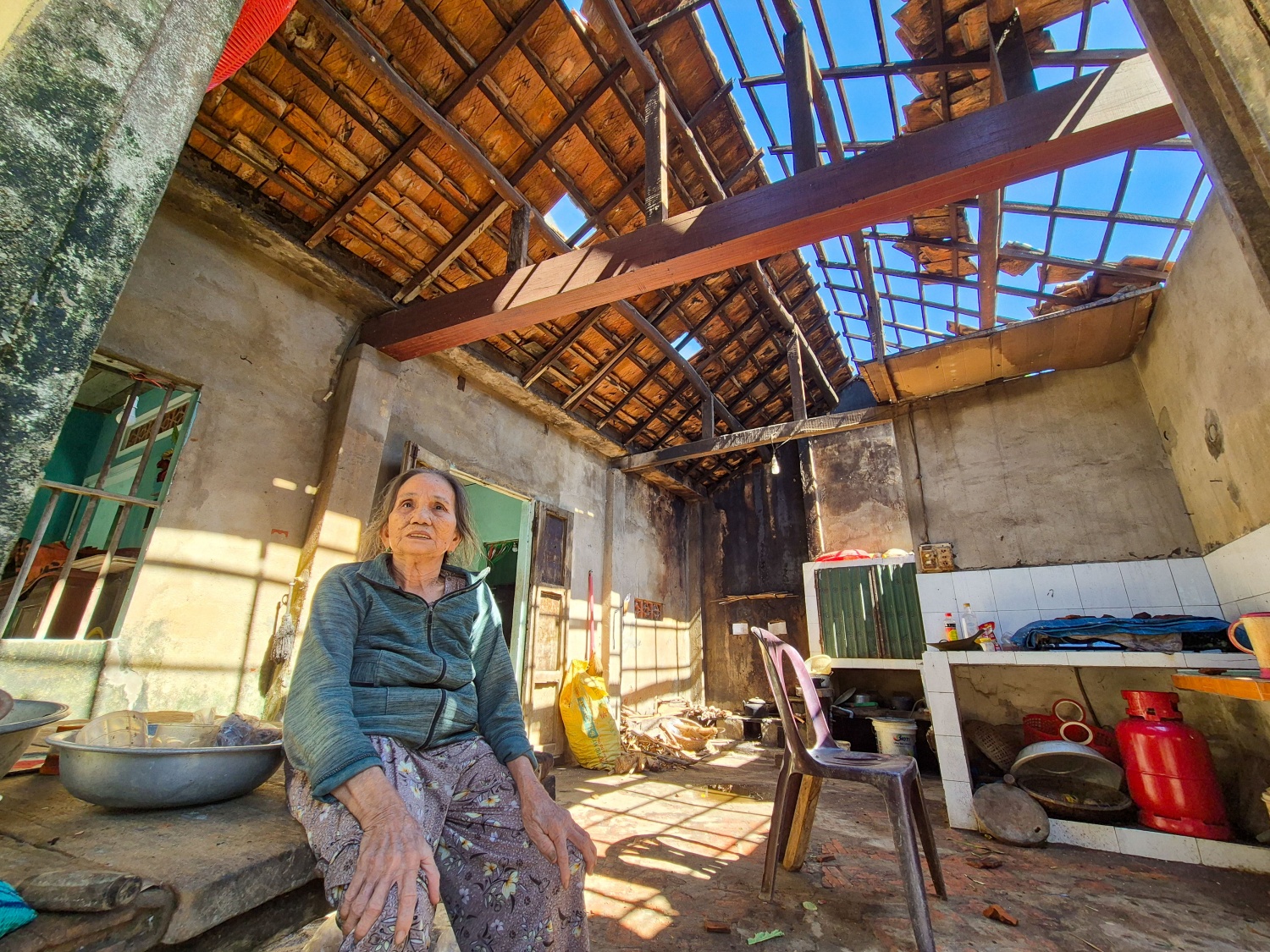 Cách nhà ông Thu khoảng 1km, bà Võ Thị Cận - 76 tuổi (thôn Thanh Long) cũng gặp trường hợp tương tự. Bà Cận sinh sống một mình tại căn nhà cấp 4, khi được chính quyền vận động đi tránh trú, bà đã chuyển sang ở xen ghép với một người thân để đảm bảo an toàn. Tuy nhiên, khi trở về, căn nhà đã bị thiên tai gây hư hỏng, phần mái tôn đã bị thủng nhiều chỗ, để lại nhiều khoảng trống.