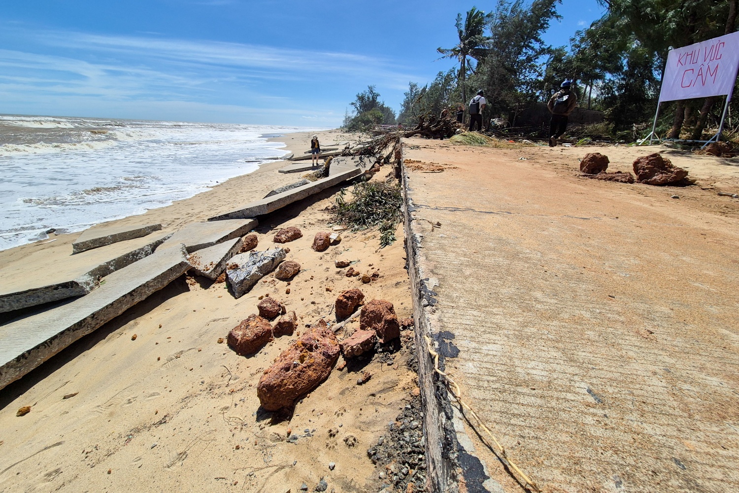 Tuyến đường ven biển tại thôn Đức Lợi bị sóng đánh trong đêm ngày 6/11 đã bị hư hỏng hoàn toàn. Hiện chính quyền địa phương đã đặt biển cấm đi lại và triển khai các phương án khắc phục hậu quả.