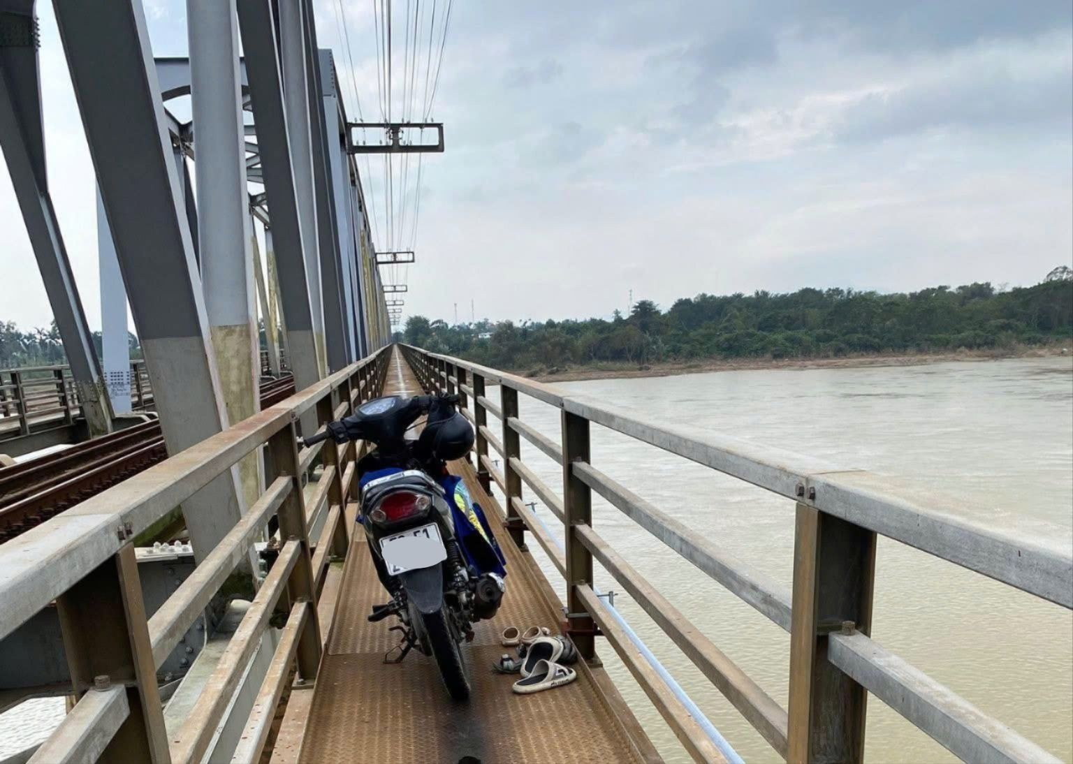 Khi đến gần giữa cầu, anh V.V.T. bất ngờ dừng xe, ôm theo 2 cháu nhỏ nhảy xuống sông, bỏ lại xe máy, dép, mũ, ba lô,... trên cầu.