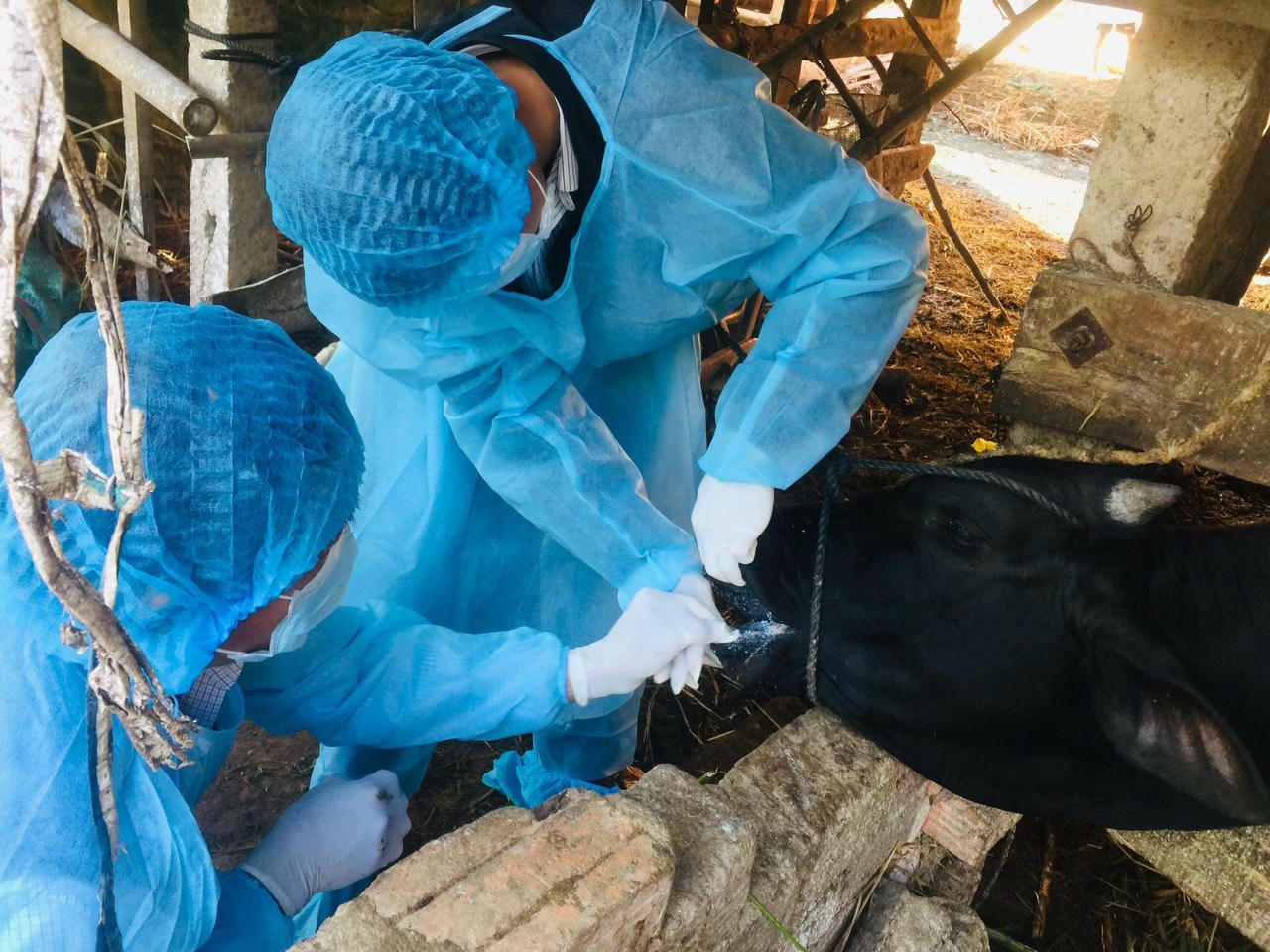 Lực lượng chức năng Quảng Ngãi tiêm vaccine phòng bệnh gia súc. Ảnh: CV.