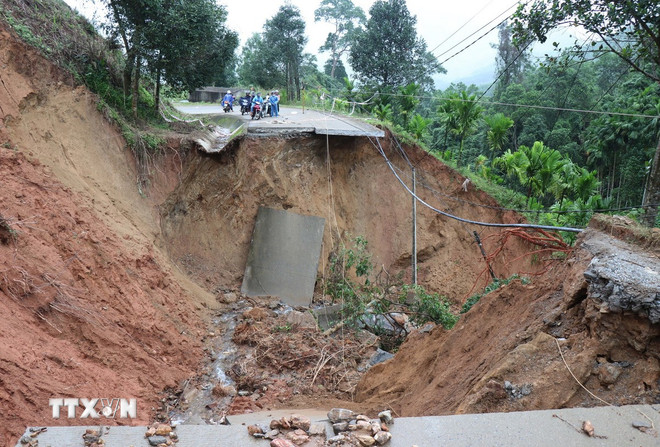 Mưa lớn làm nền đường trên tuyến ĐH83, đoạn Km5+500 qua thôn Hà Lên, bị đứt gãy, sụp lún với chiều dài khoảng 20m. (Ảnh: Phạm Cường/TTXVN)