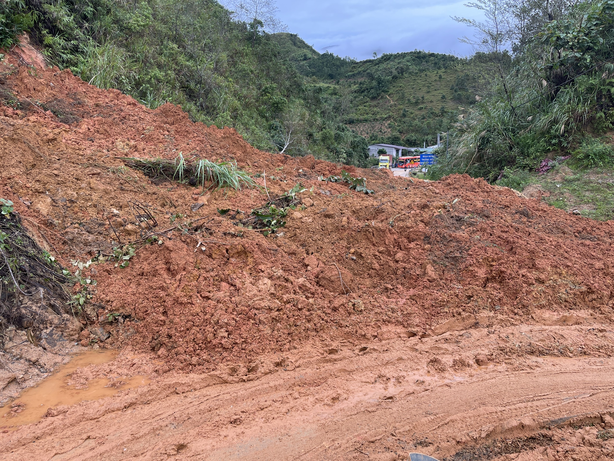 Tại hiện trường, một khối lượng lớn đất đá đổ tràn xuống mặt đường, khiến các phương tiện ở hai đầu phải dừng chờ, không thể lưu thông.