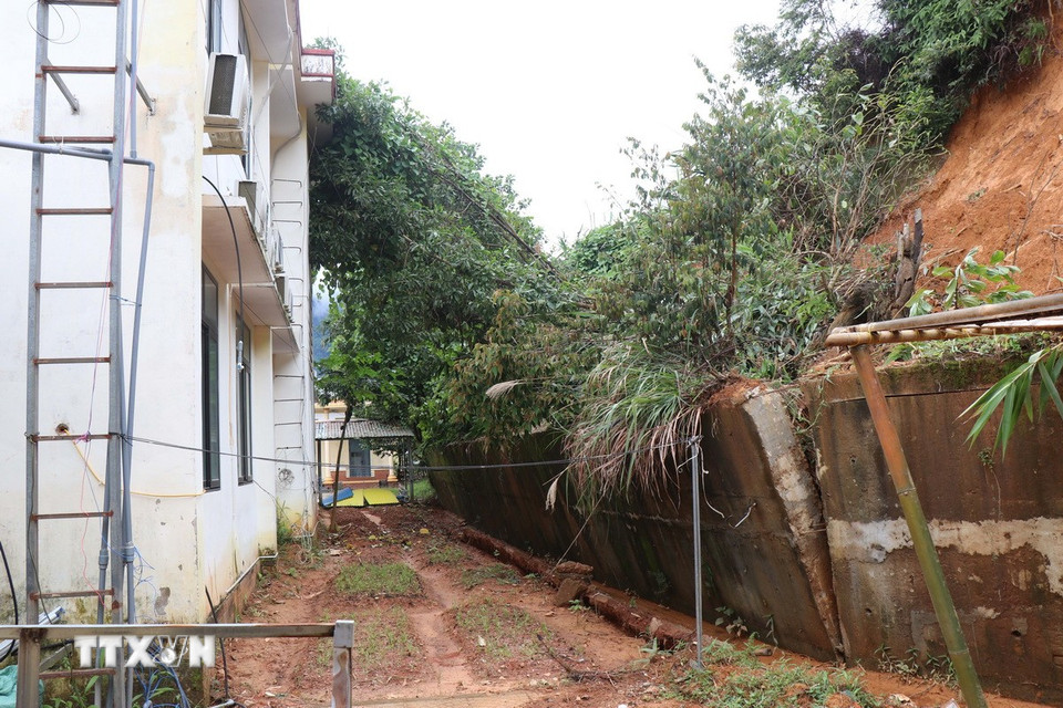 Sạt lở đồi đất gây đổ nghiêng kè bêtông sau lưng xã Sơn Tây Hạ (Ảnh: Phạm Cường/TTXVN)