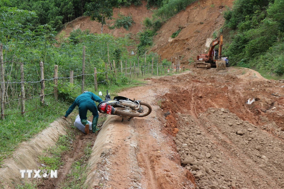 Nhiều người té ngã khi lưu thông qua 3,5km đường Sơn Tinh Sơn Thượng, xã Sơn Tây Hạ lầy lội, trơn trượt do mưa lũ. (Ảnh: Phạm Cường/TTXVN)
