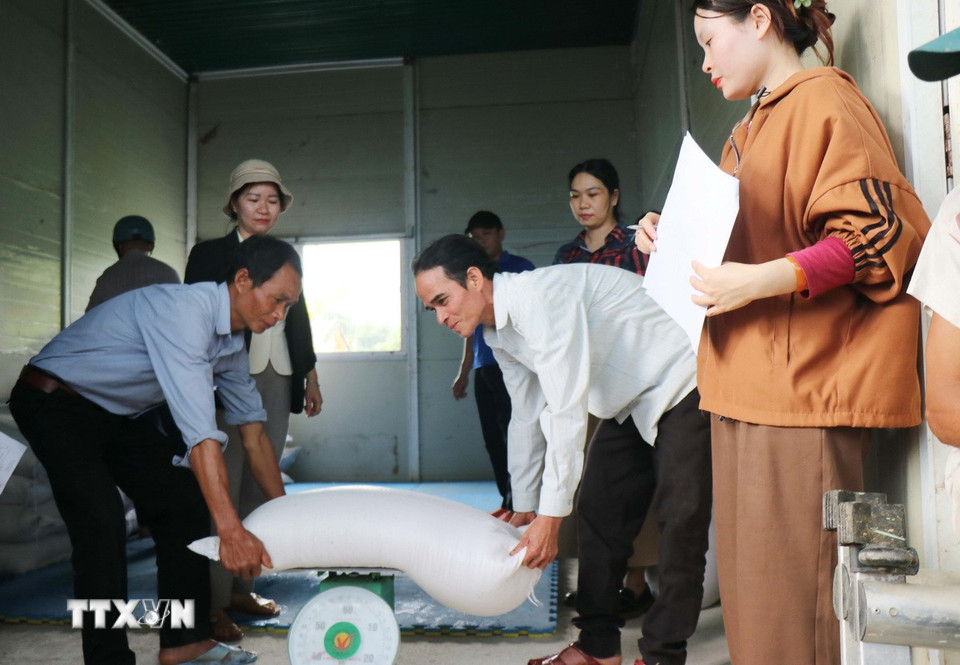 Do đường đứt gãy sạt lở xã Sơn Tây Hạ nên ôtô không thể vào trung tâm, lãnh đạo xã Sơn Tây đã huy động gạo từ các trường học để cứu trợ người dân. (Ảnh: Phạm Cường/TTXVN)
