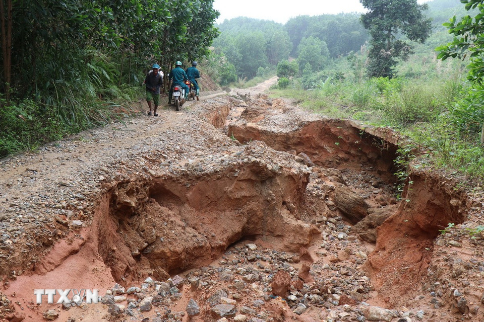 Mưa lớn làm nền đường trên tuyến ĐH83, đoạn Km5+500 qua thôn Hà Lên, bị đứt gãy, sụp lún với chiều dài khoảng 20m. (Ảnh: Phạm Cường/TTXVN)