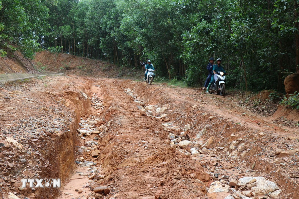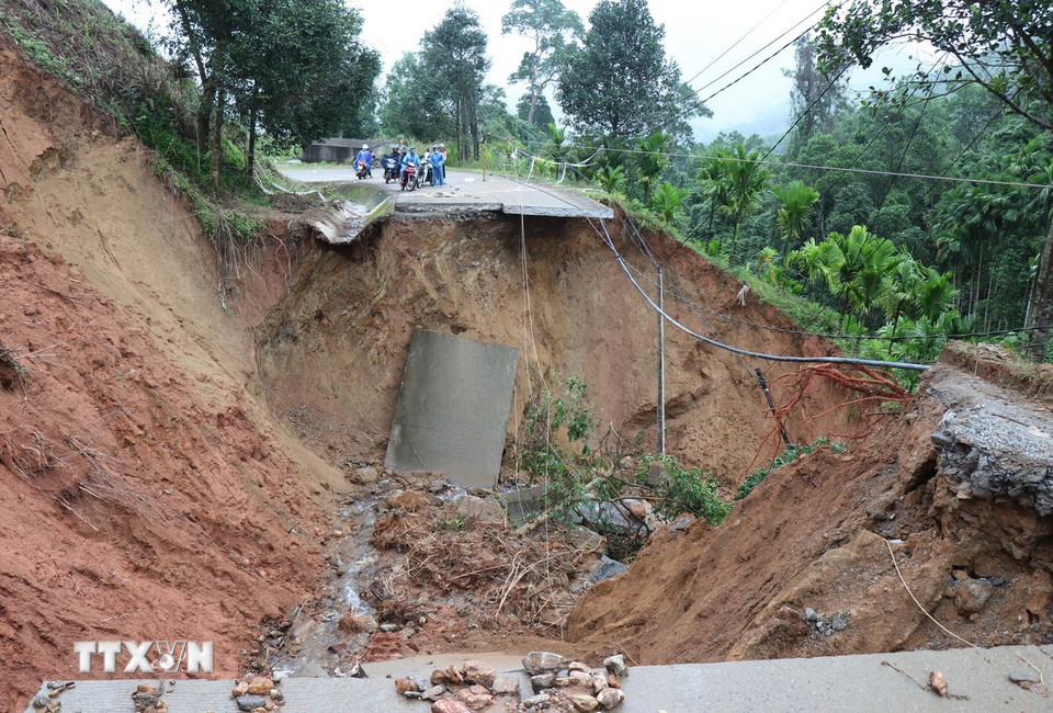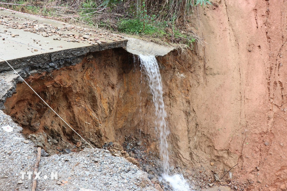 Tuyến đường ĐH83, đoạn Km8+200 qua thôn Tà Vinh, trục “xương sống” chạy dọc phía Tây xã Sơn Tây Hạ bị đứt gãy với chiều dài 40m, gây chia cắt giao thông. (Ảnh: Phạm Cường/TTXVN)