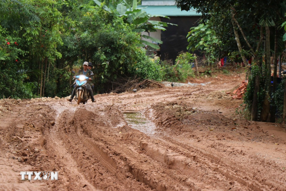 Nước lũ khiến mặt đường Sơn Tinh-Sơn Thượng, xã Sơn Tây Hạ lầy lội, trơn trượt, tạo thành các rãnh sâu khiến người dân gặp nhiều khó khăn. (Ảnh: Phạm Cường/ TTXVN)