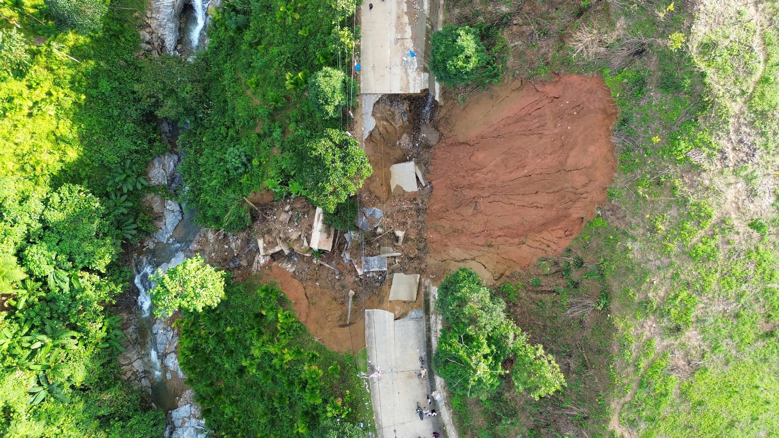 Tuyến đường ĐH83 từ tỉnh lộ 623 đi xã Sơn Tây Hạ bị sạt lở nghiêm trọng với hàng chục vị trí. Trong đó, đoạn qua Km 8+200, sạt lở cuốn phăng gần 50m đường cùng hệ thống cống rãnh, trụ viễn thông và điện lực bị kéo trượt xuống vực sâu, tạo thành một hố sụt lớn khiến giao thông vào xã bị chia cắt hoàn toàn.
