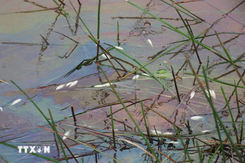 Váng dầu tràn ra ruộng sản xuất lúa của người dân xã Vạn Tường gây hiện tượng cá chết. (Ảnh: Phạm Cường/TTXVN)