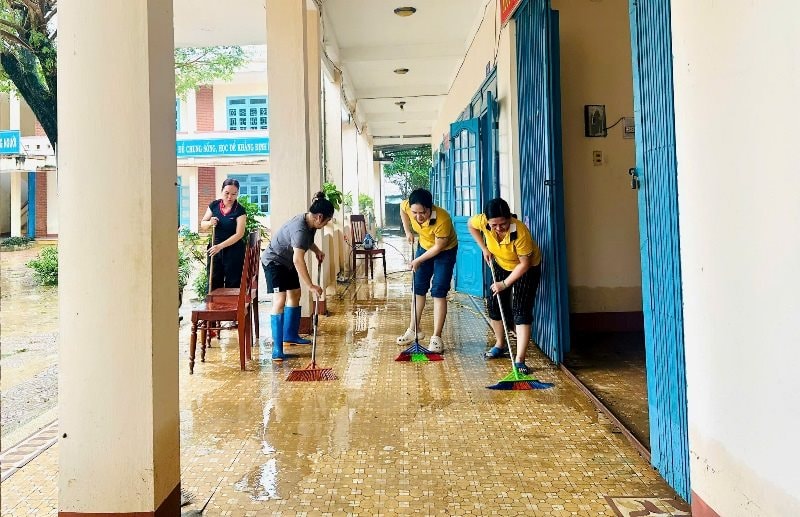 Tại Trường Mầm non Hành Dũng (xã Phước Giang) hàng chục cán bộ, giáo viên cùng lực lượng chức năng khẩn trương vệ sinh, khử trùng, sẵn sàng đón trẻ trở lại trường ngay khi hết mưa lũ.