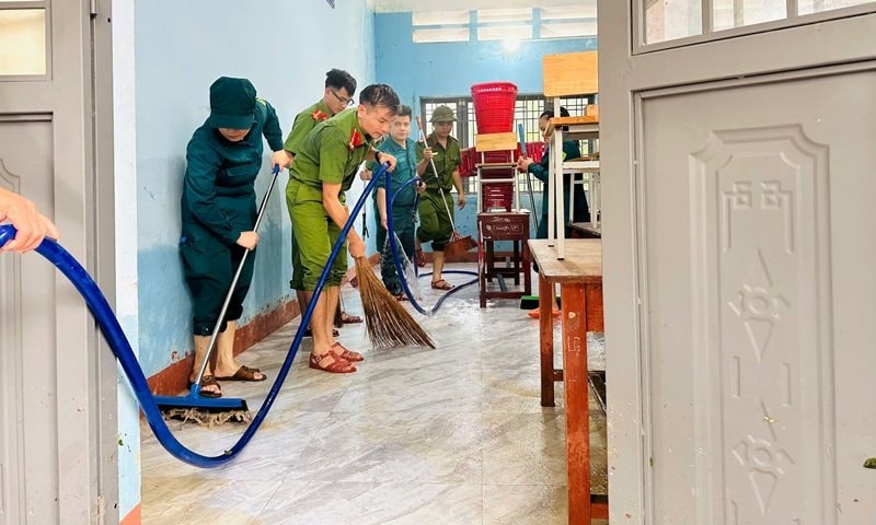 Lực lượng Công an xã cùng dân quân xã Phước Giang dọn dẹp tại trường Mầm non Hành Dũng ngay sau khi nước rút.